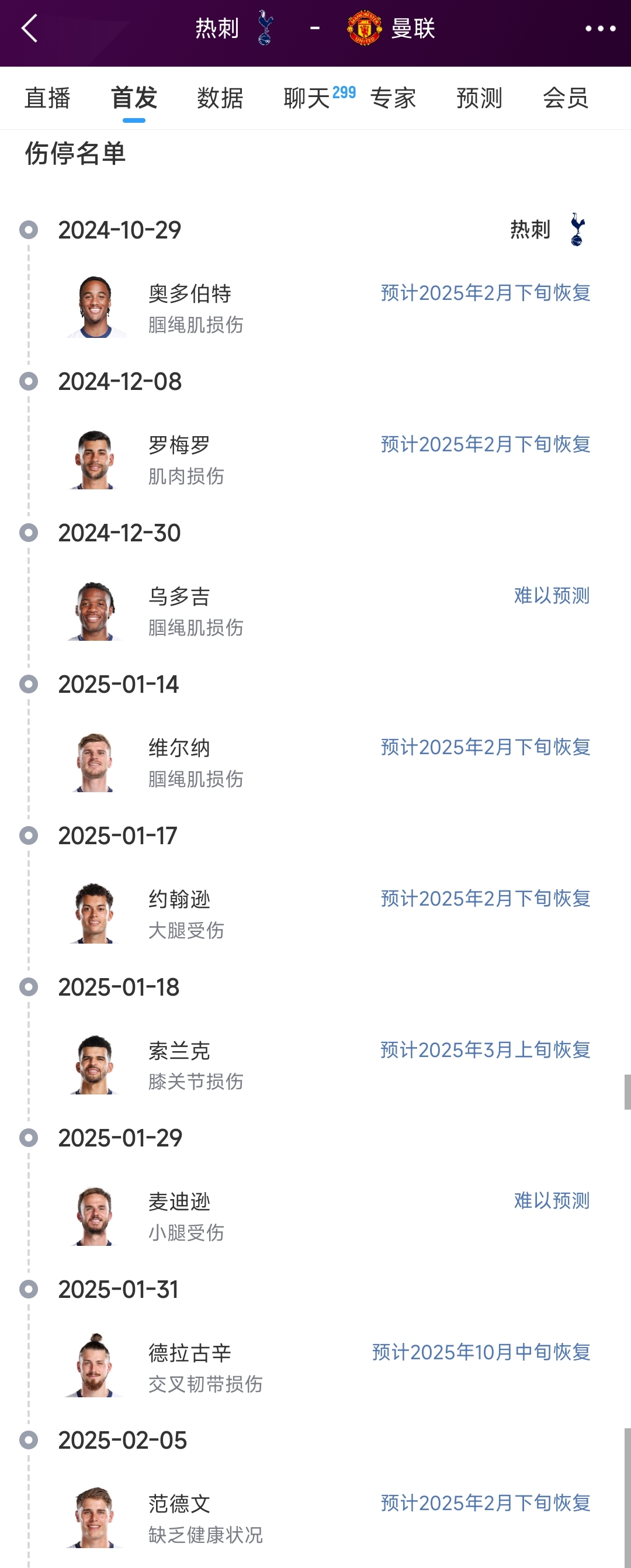 病友局英超第15热刺vs第14曼联伤停名单,两队伤了17个人