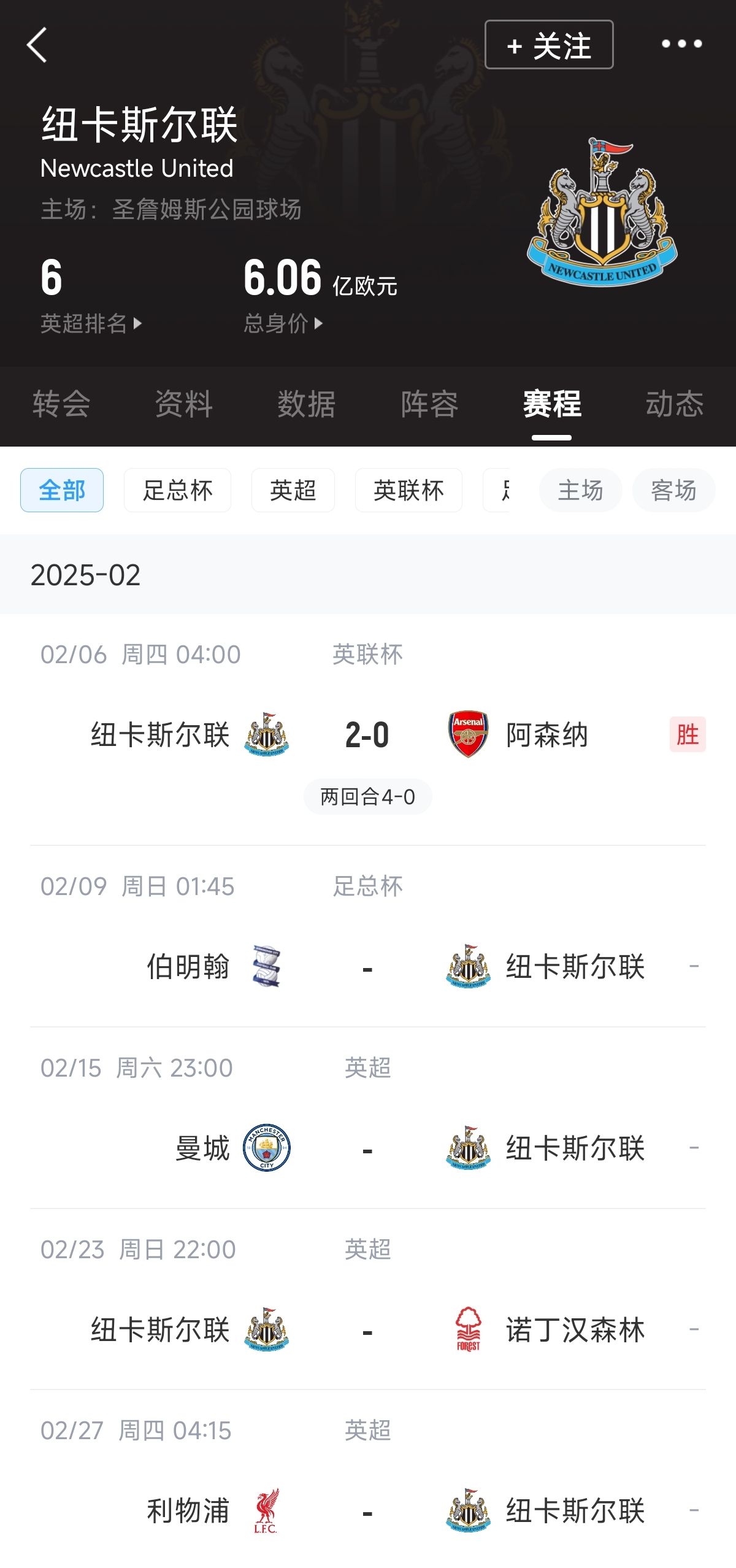 02月06日宣 联赛杯次回合,纽卡再度2-0击败阿森纳,完成对阿森纳的两回合双杀。