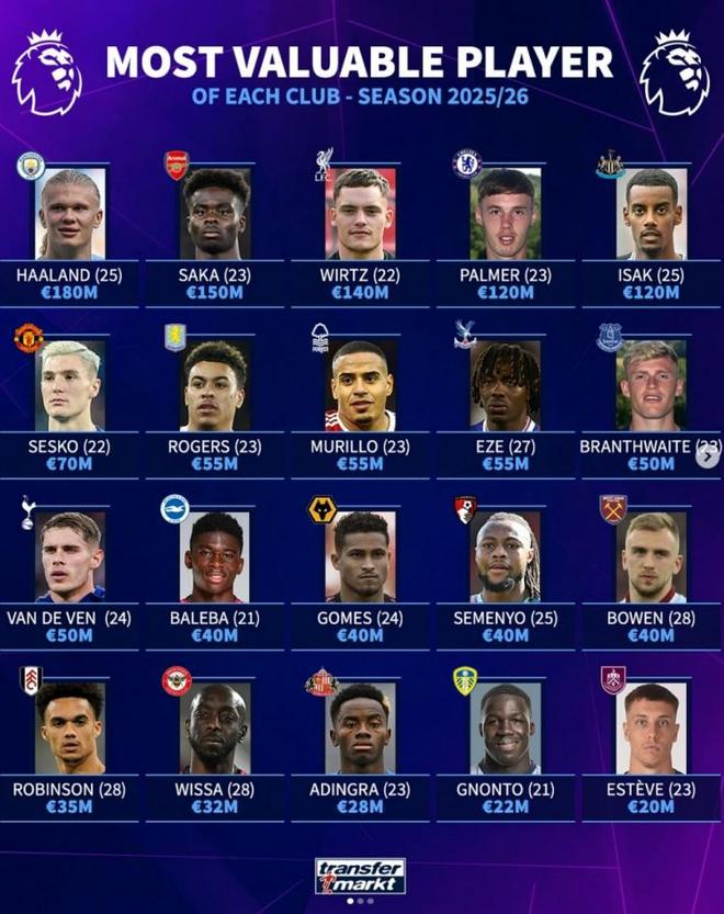 直播吧8月17日宣 新赛季英超已经开幕,德转也盘点了英超20支球队中身价最高的球员,其中哈兰德1.8亿欧领衔,具体如下: