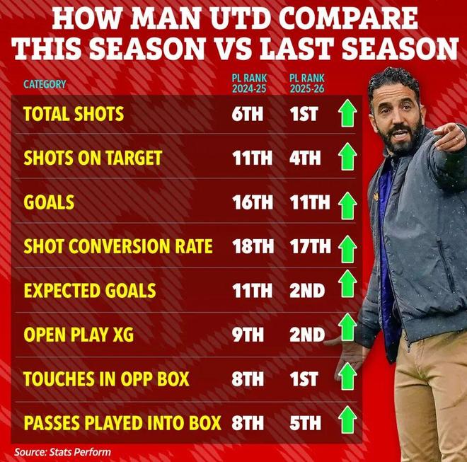 然而,阿莫林花了2亿英镑引进新前锋,依然没有改变球队无法得分的最大问题,曼联在进球数方面排名第11位,在射门转化率方面则排名第17位。阿莫林无疑面临着一场艰巨的、甚至不可能完成的挑战。