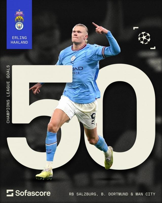 哈兰德也成为第10位达成欧冠50球成就的球员。