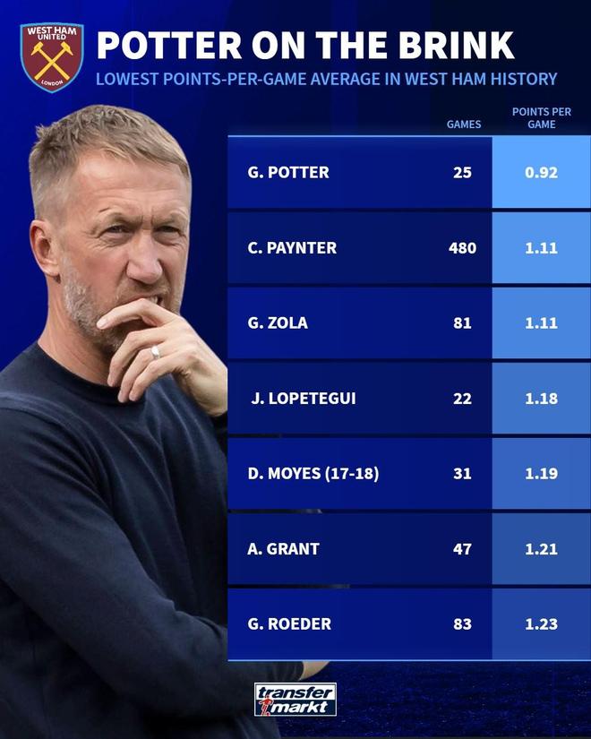 赛后根据德转的统计,自波特今年1月接手西汉姆联以来,这位英格兰教头率队出战了25场正式比赛,总成绩仅为6胜5平14负,场均积分只有0.92分,这也意味着波特成为了铁锤帮队史场均积分最低的主教练。
