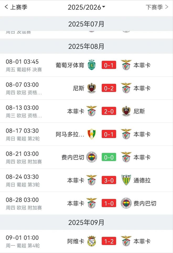 说到这,我们这里来看看拉热的本菲卡战绩如何,就先看看8月份的,哎呀!这不看不知道,一看吓一跳,不愧是塞巴图尔最靓的仔,零封八月,一球未失,哪怕后防核心是36岁的前曼城中卫奥塔门迪,7场比赛,也只有首回合面对穆里尼奥执教的费内巴切,没有进球,这战绩其实是不错的。
