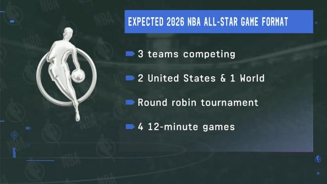 北京时间9月23日,据ESPN名记Shams消息,2026年NBA全明星赛将采用全新赛制,分为两支美国队和一支国际队,采用轮番赛格式,旨在提升比赛竞争性和展示全球人才。