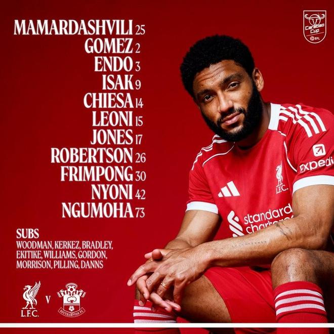 利物浦首发:25-马马尔达什维利、26-罗伯逊、2-乔-戈麦斯、15-乔瓦尼-莱昂尼、30-弗林蓬、17-柯蒂斯-琼斯、3-远藤航、42-尼奥尼、14-费代里科-基耶萨、73-恩古莫哈、9-伊萨克
