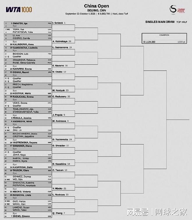 我们再来关注中网。北京时间昨晚,WTA1000中国网球公开赛公布了女单正赛签表。前八大种子的对位:上半区,斯瓦泰克--佩古拉、郑钦文--米拉-安德列娃;下半区,阿尼西莫娃--鲍里妮、莱巴金娜--高芙。