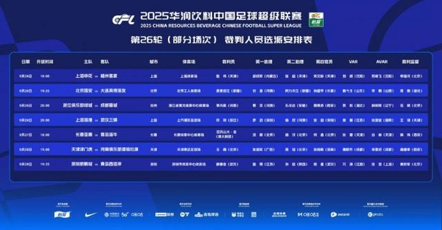 直播吧9月26日宣 中超联赛公布第26轮裁判安排,麦麦提江执法国安vs英博的比赛,外籍裁判亚历山大-金执法亚泰vs海牛的保级大战。