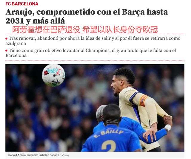 《世界体育报》指出,阿劳霍一度考虑离开巴萨,尤其是2024年夏窗、2025年冬窗。不过1月23日,阿劳霍与巴萨续约至2031年,6500万欧元解约金条款失效,乌拉圭悍将下定决心,要在巴萨踢出名堂。