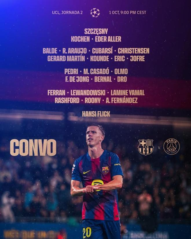 雷速体育10月1日宣 欧冠第二轮,巴萨vs巴黎。赛前,巴萨公布本场比赛大名单。