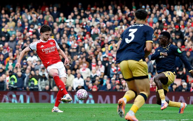 第65分钟苏维门迪挑传前场,廷伯顺势转身拿球被防守球员撞倒,为球队赢得一粒点球,此战迎来英超200场里程碑的萨卡主罚命中,完成了生涯参与的第100粒英超进球,同时将比分改写为了2-0,余下的时间,阿森纳仍然牢牢掌控着局面,虽然没有进一步扩大优势,但防守端也没有给对手任何的机会,如愿在主场零封获胜。