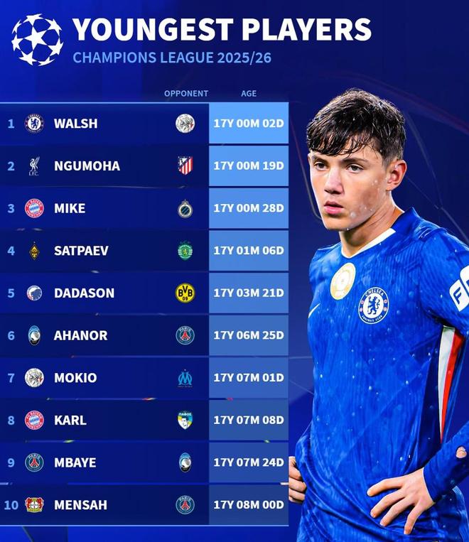 - 欧冠 | 本赛季欧冠最年轻出场球员前10:切尔西小将雷吉沃尔什第1