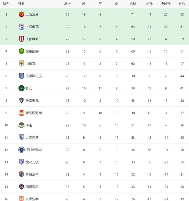 - 中超 | 随着海港30浙江,申花10,中超最新积分榜:蓉城被逆转退出争冠