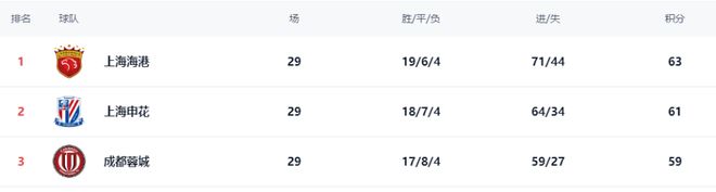 29轮之后,上海海港以63分排名榜首,上海申花以61分排名第2,成都蓉城则以59分排名第三位,提前1轮退出冠军争夺。
