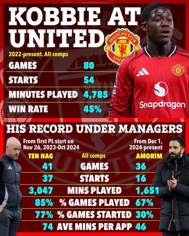 在滕哈格执教期间,从2023年11月对埃弗顿完成联赛第一次首发后,梅诺在52场曼联的比赛先发出场37次。但阿莫林执教后55场比赛,他只有16次首发。