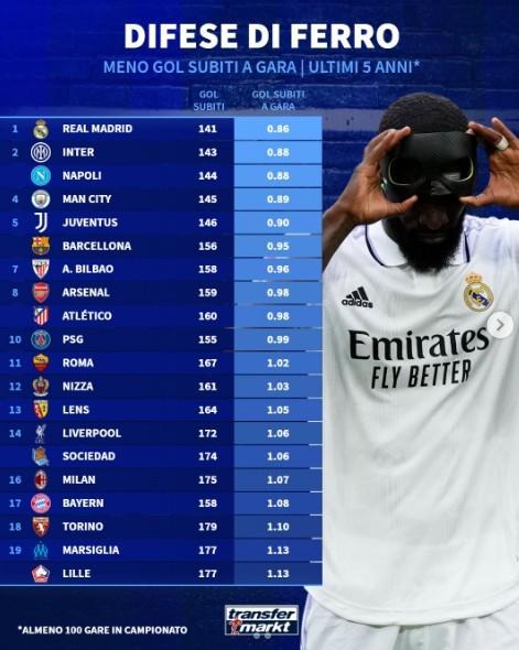 近5年五大联赛场均失球最少榜:皇马0.86球第1,国米0.88球第2