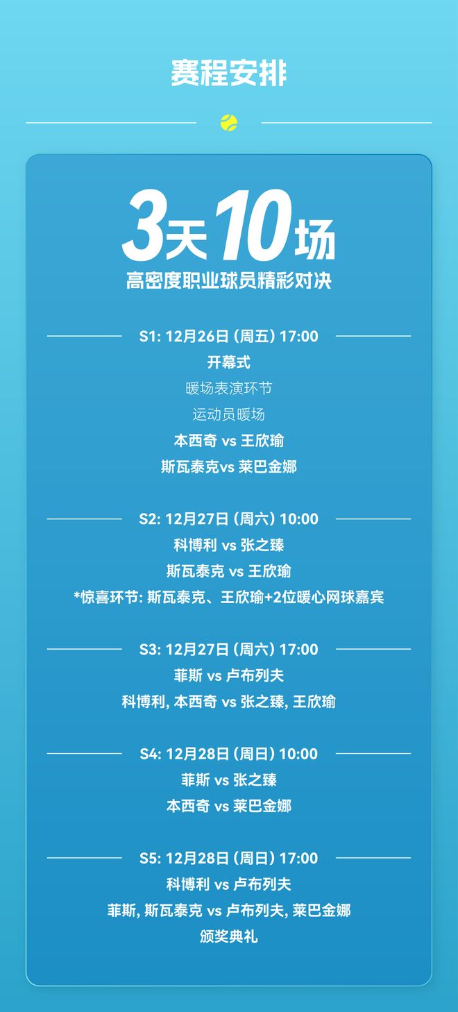 首届世界网球洲际对抗赛(WTCC)球星阵容堪称豪华,其星光璀璨程度成为赛事开篇的最大亮点,即便放在整个网坛表演赛的历史长河中,也堪称极为罕见的顶级配置。女子球员方面,六届大满贯得主斯瓦泰克、温网冠军莱巴金娜、奥运金牌得主本西奇与本土宠儿、奥运银牌得主王欣瑜将联袂亮相,阵容堪比“WTA版沙特六后大满贯”;男子球员方面,两届大师赛冠军卢布列夫、奥运银牌得主张之臻领衔出战,近年来圈粉无数的实力新星菲斯、科博利强势加盟,势必将碰撞出不亚于拉沃尔杯的精彩火花。