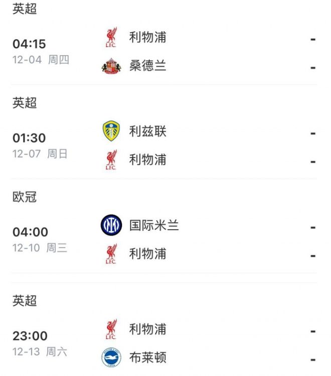 更令利物浦球迷绝望的是,在进入12月份之后,红军将迎来一个魔鬼赛程,在12月4号到12月13号这短短9天内,他们要踢4场比赛,每场比赛的间隔时间平均下来甚至还不到3天。