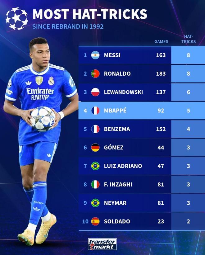 - 欧冠 | 欧冠92年改制后戴帽数前10:梅西、C罗8次第1,姆巴佩5次第4