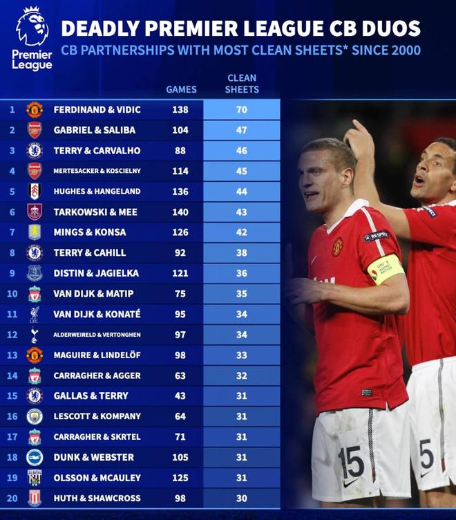 - 英超 | 德转统计本世纪英超首发中卫搭档零封榜:费迪南德+维迪奇第1